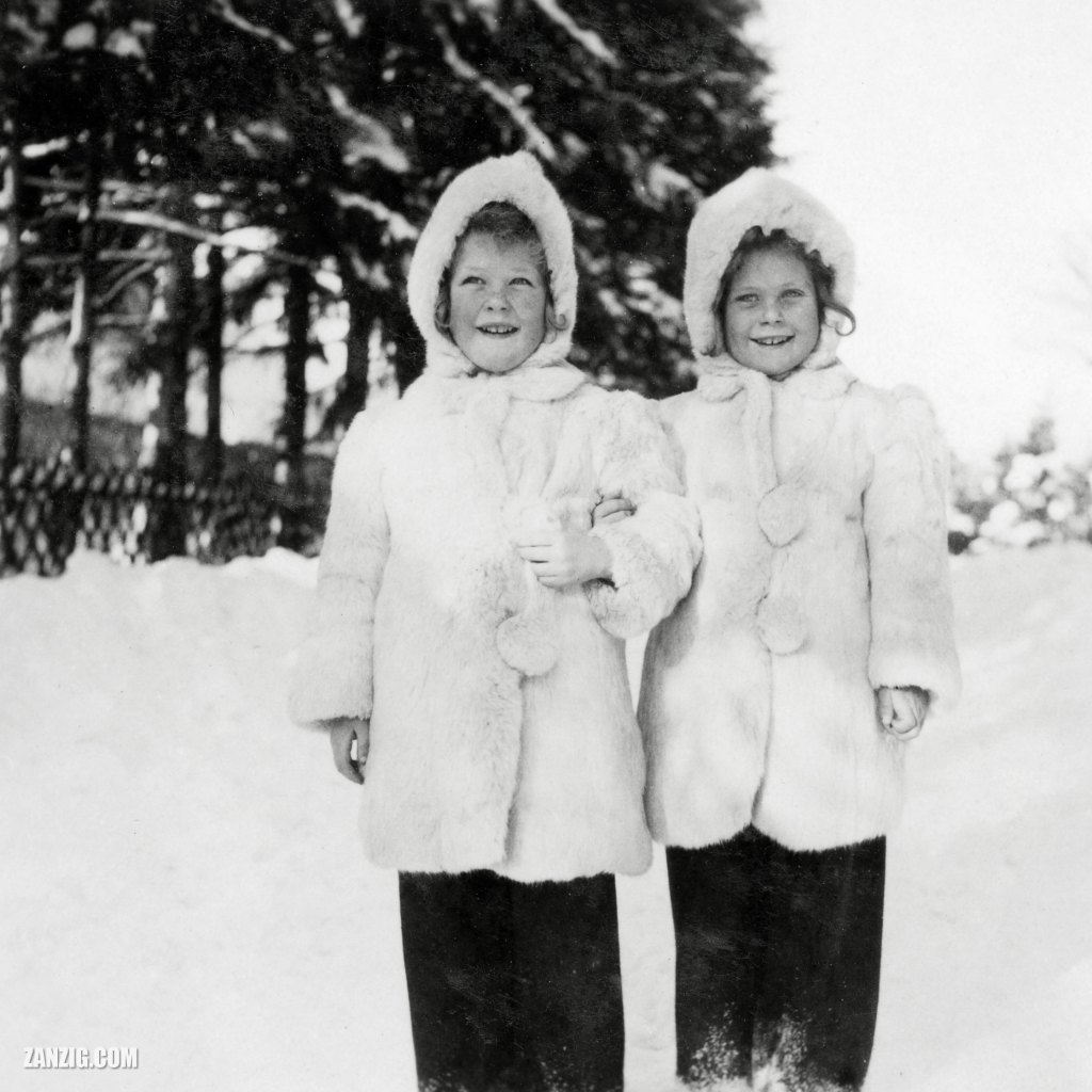 JANUARY 1947 – After heavy snowfalls, the girls of the Schweim family – Inga (left) and Editha – pose for the photographer in Malente-Gremsmühlen, Germany. Scan © Mark Zanzig/zanzig.com