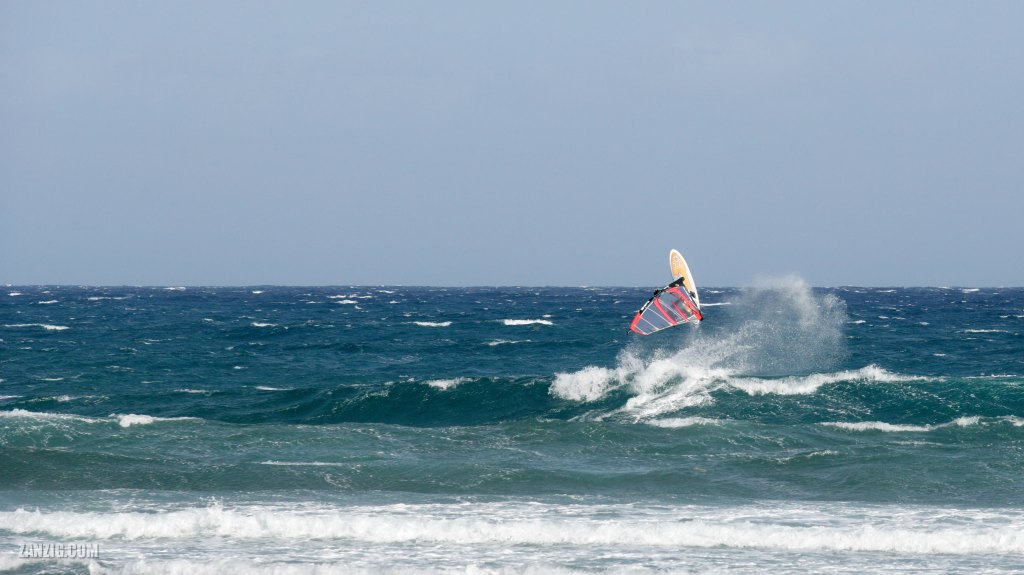 NOVEMBER 2005 – A windsurfer performs a stunt by darting straight into the air at the Playa Grande of Los Abrigos, Tenerife, Spain. Photo © by Mark Zanzig/zanzig.com
