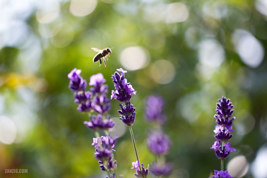 JULY 2013 – Close-up of a bee approaching a genuine lavender (Lavandula Angustifolia) on a sunny day. © Mark Zanzig/zanzig.com