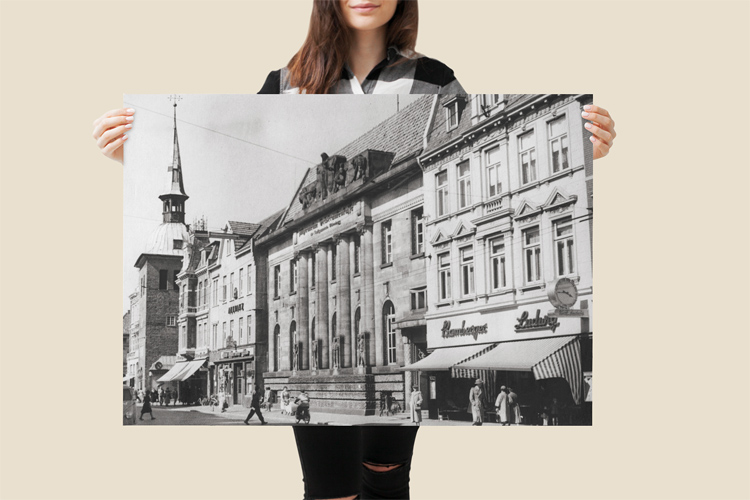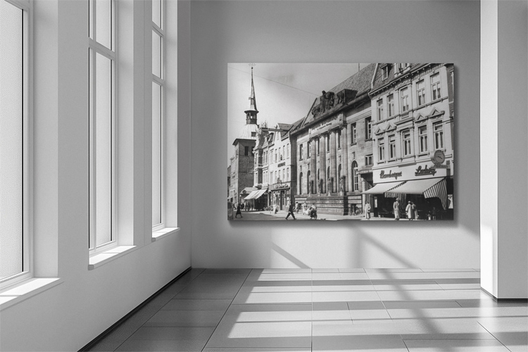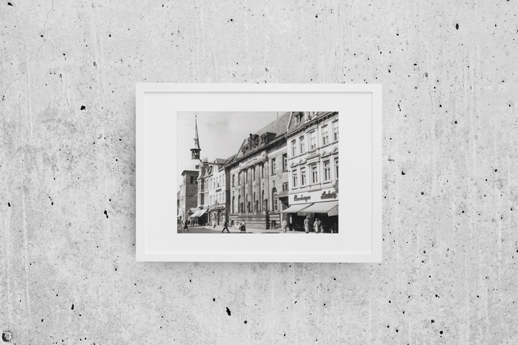 MAY 1955 – View along the Lange Straße in in Oldenburg (Lower Saxonia), Germany, with the iconic clock tower Lappan on the left. © Mark Zanzig/zanzig.com