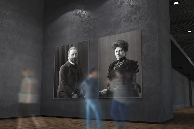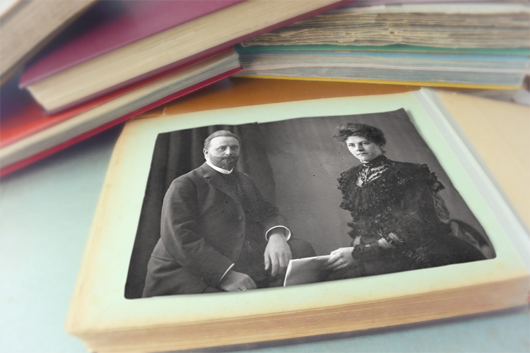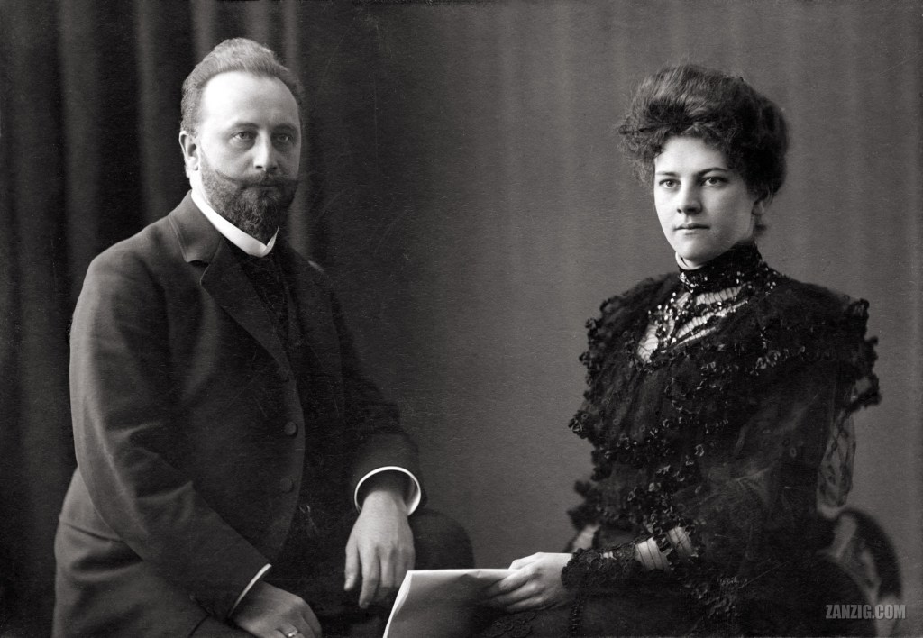 1905 – Hugo Max Arnold Schütze (1868-1953) and his wife Martha (1882-1965) in a photo studio in Bochum, Germany. Photo: Heinrich Kuhlmann