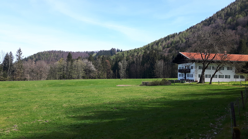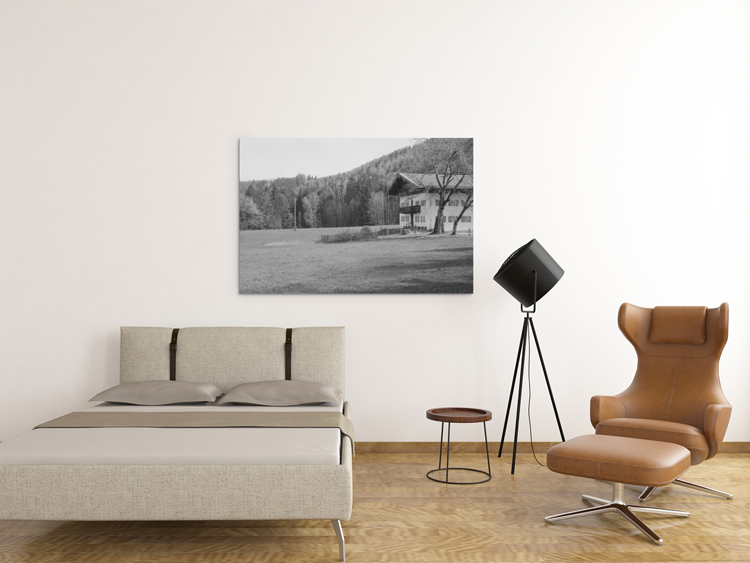 One day in April 2024 I took the camera to a hike near Aschau i. Chiemgau. Close to the parking lot at the trailhead I discovered this building with the large meadow. The scene was a dream of blue and green. The red roof of the house added a nice contrast. How would that develop in genuine b&w? Not too exciting, I’d say. But the camera did a good job capturing the scene.