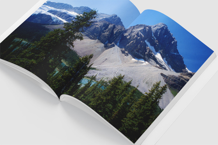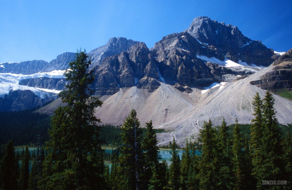 AUGUST 2002 – Bow Lake shimmers in bright turquoise through the trees of the Banff National Park, Alberta, Canada, with the Crowfoot Glacier and the Vulture Peak as backdrop. © Mark Zanzig/zanzig.com