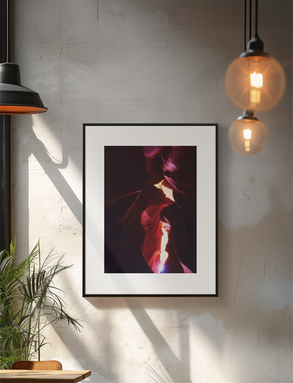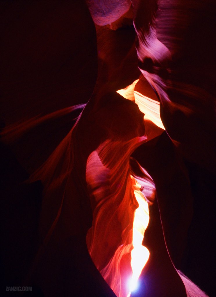 SEPTEMBER 2003 – The sun illuminates the red and purple walls inside Antelope Canyon in Arizona. Photo © by Mark Zanzig/zanzig.com