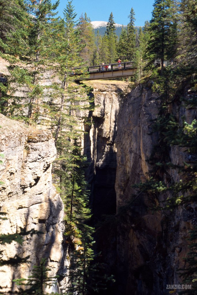 AUGUST 2002 – On a beautiful summer day, visitors enjoy the view from the Second Bridge at the Maligne Canyon near Jasper, Alberta. © Mark Zanzig/zanzig.com
