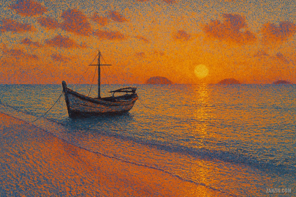 APRIL 2025 – AI generated image showing a sunset at a beach with an old boat, pointilism style. © Mark Zanzig/zanzig.com/Photo: ChatGPT