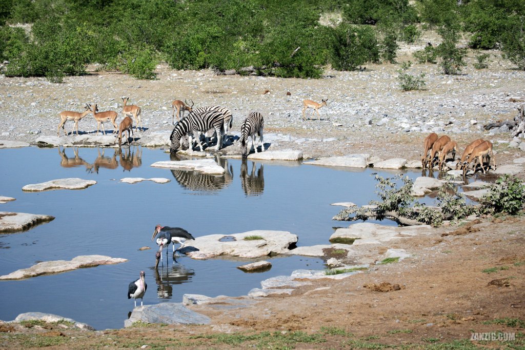 NOVEMBER 2006 – Zebras and impalas drink at the Moringa waterhole in Namibia’s Etosha National Park. Photo © by Mark Zanzig/zanzig.com