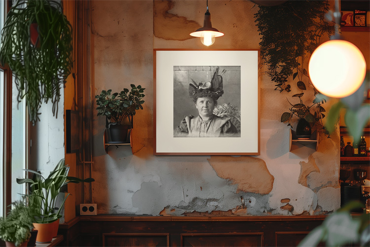 - Photographic Style: The photograph has the soft grayscale tone and backdrop style of late 19th-century studio portraits. The use of a wicker chair also was a popular studio prop in the 1890s-1900s.