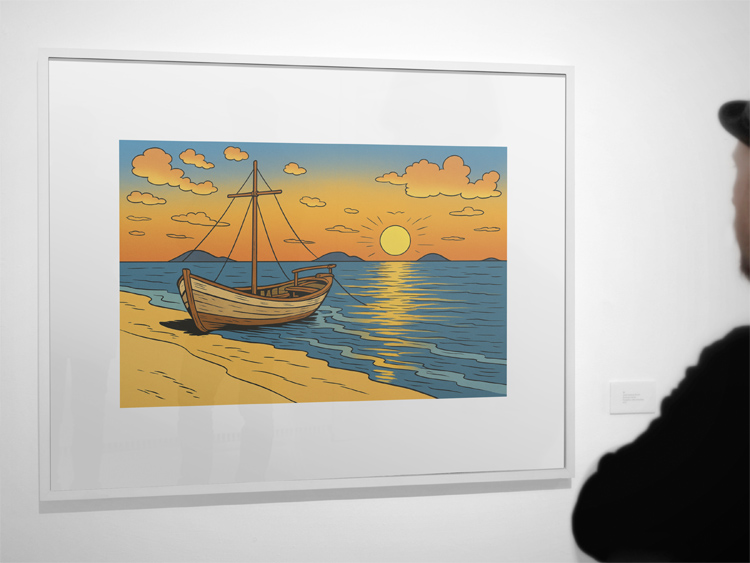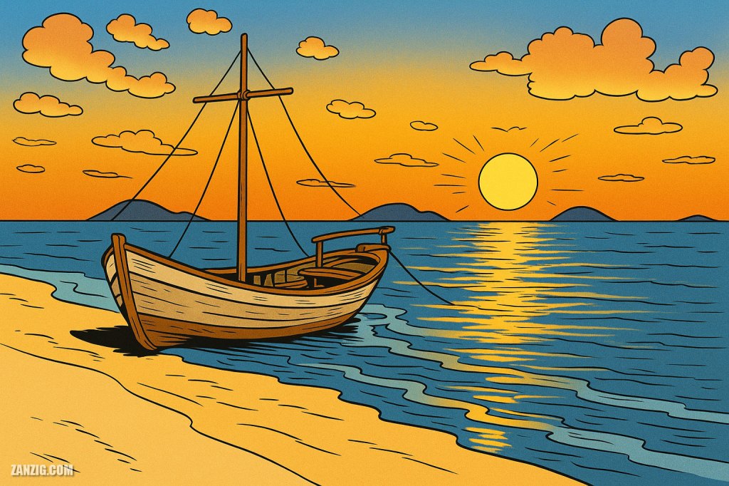 MAY 2025 – AI generated image showing a sunset at a beach with an old boat, comic style. © Mark Zanzig/zanzig.com/Photo: ChatGPT