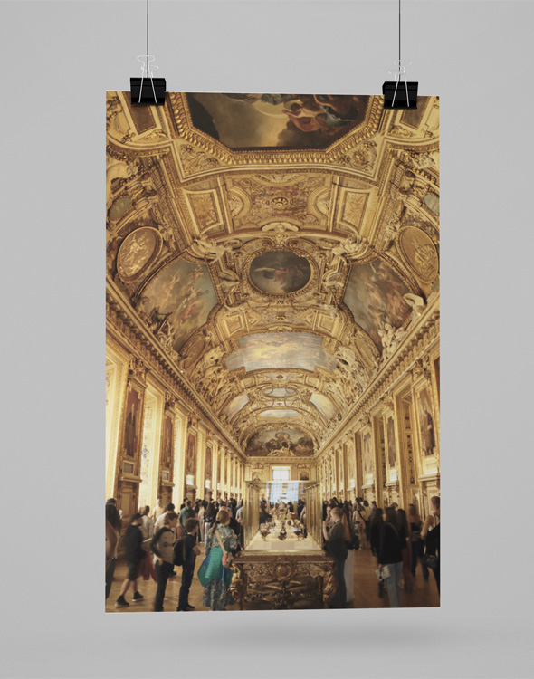 My photo shows The Galerie d’Apollon (Room 705, Denon wing, Level 1). Visitors admire the royal collection of hardstone vessels (under glass) or just flow along the long room which presents more jewelry (including The French Crown Jewels, also under glass), countless paintings, and plenty of gold. The museum has an extraordinary page dedicated to this room.