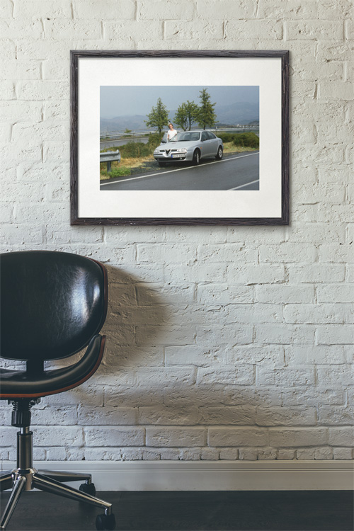 AUGUST 2000 – Petra Zanzig stands next to an Alfa Romeo 156 2.0 TSpark parked on the curb of the SS26 near Piantonia in Italy. Photo © Mark Zanzig/zanzig.com