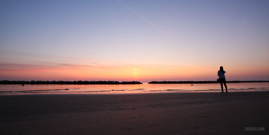 And now I sat on the sunchairs of Bagno 46 and admired the sunrise. A woman came by and did the same, just more closely to the water. She took her camera and captured the sunrise. The harsh contrast turned her into a silhouette and gave the center of the stage to the sunrise.