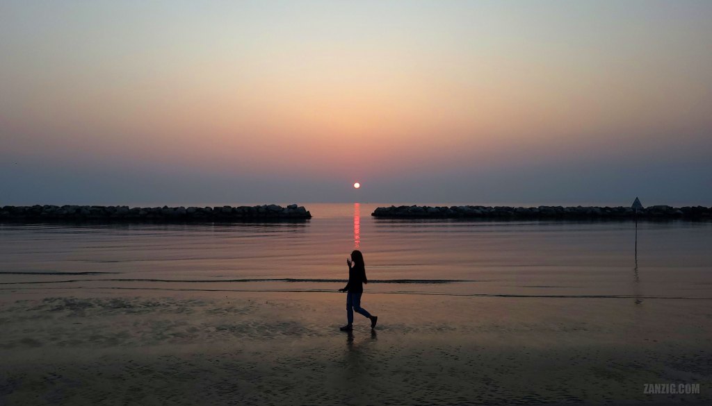 JUNE 2025 – A woman admires the sunrise while walking along the beach of Bellaria Igea Marina near Rimini, Italy. Photo © Mark Zanzig/zanzig.com