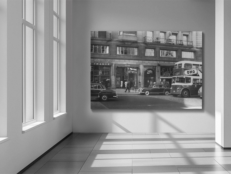 This is a beautiful black and white print from 1957 showing the prestigious Gran Via 53-55 in Madrid on a busy day. Several observations are noteworthy in my opinion: