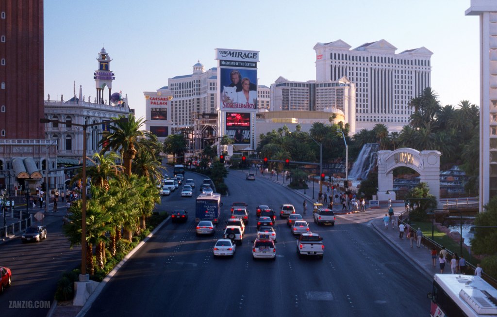 SEPTEMBER 2003 – View along Las Vegas Boulevard South in the late afternoon, with The Mirage hotel on the right and The Bellagio and Caesar’s Palace in the back. © Mark Zanzig/zanzig.com