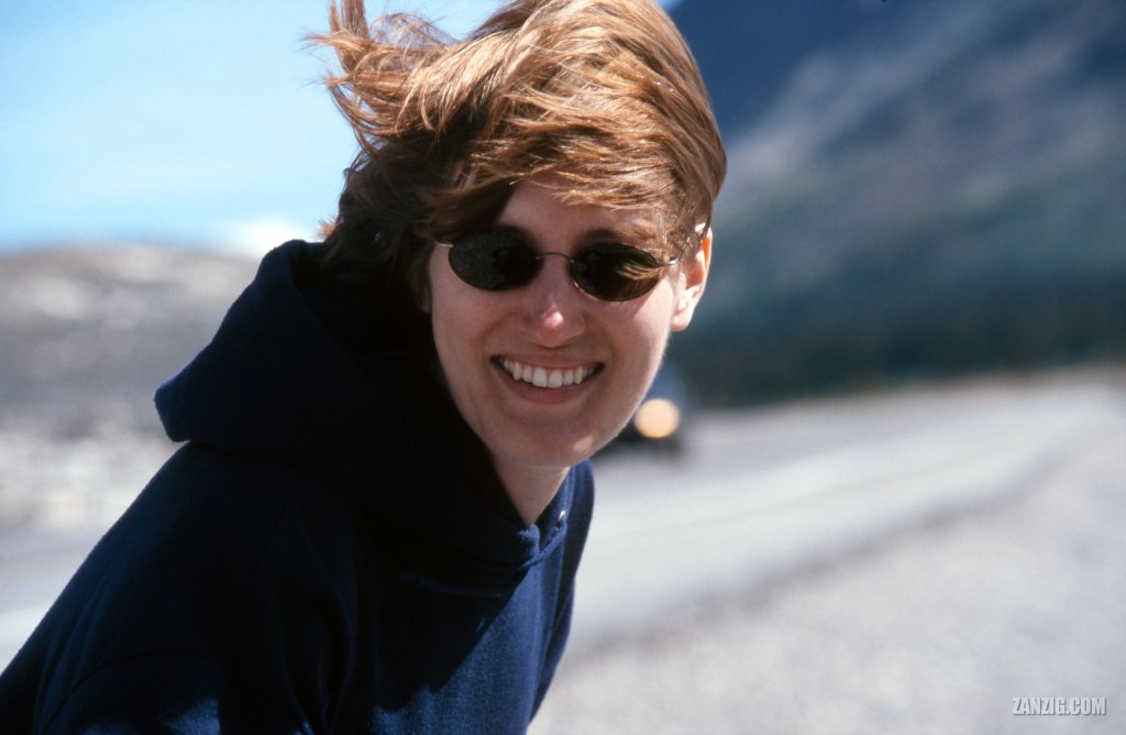 AUGUST 2002 – Petra Zanzig (29) smiles for the photographer somewhere along the Icefields Parkway in the Banff National Park, Alberta, Canada. © Mark Zanzig/zanzig.com