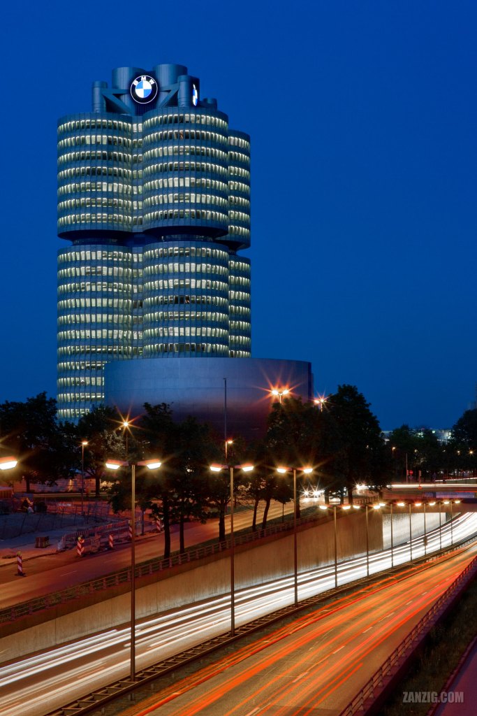 APRIL 2007 – During the blue hour, traffic rushes by next to the global headquarters of car manufacturing giant BMW AG in Munich, Germany. © Mark Zanzig/zanzig.com