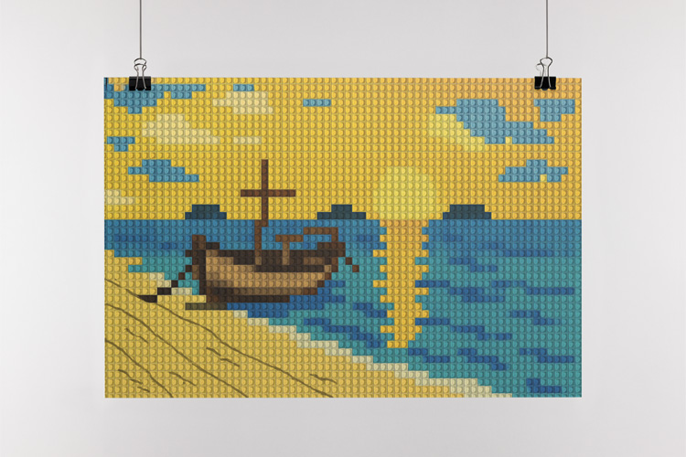 MAY 2025 – AI generated image showing a the mosaic of a sunset at a beach created out of tiny colored 1×1 bricks. © Mark Zanzig/zanzig.com/Photo: ChatGPT