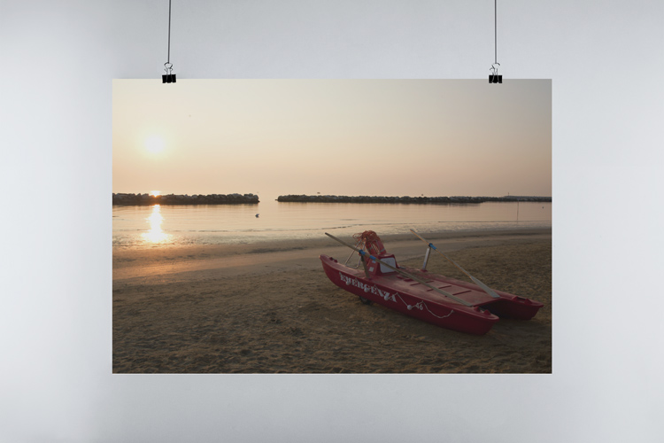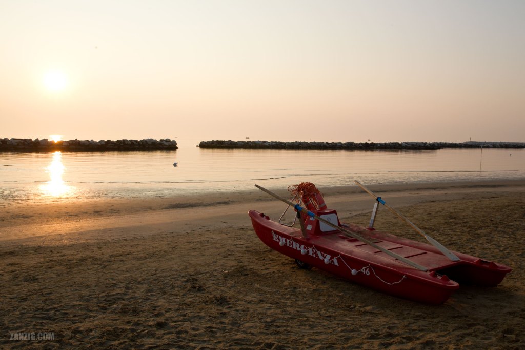 At the Mediterranean Sea, early mornings are best enjoyed at the beach because the light around sunrise is simply magical, especially when the sea is calm. At Spiaggia 46 in Bellaria Igea Marina in Italy I found this traditional Italian rescue boat.