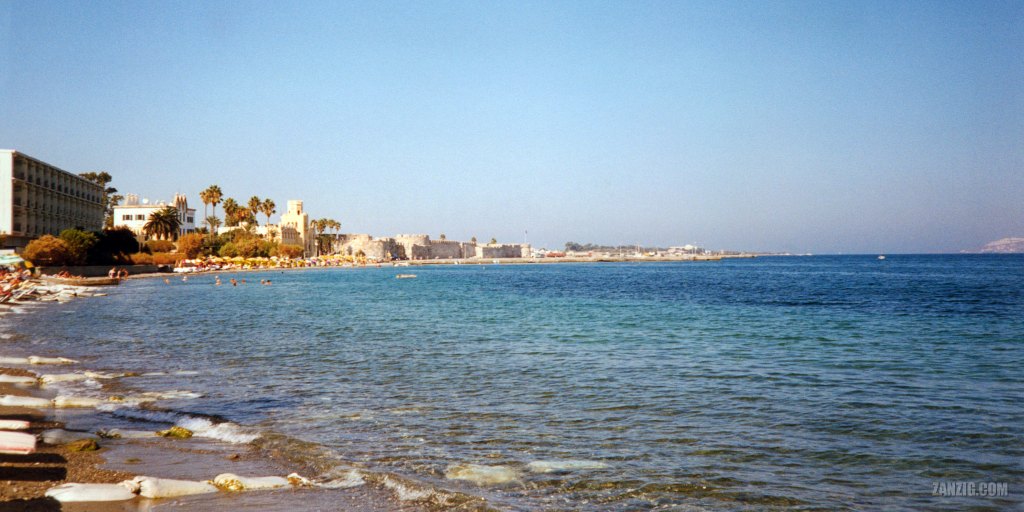 SEPTEMBER 1994 – Panoramic view of the city beach of Kos in Greece, with the fortress Kastro Neratzia in the back. Photo © by Mark Zanzig/zanzig.com