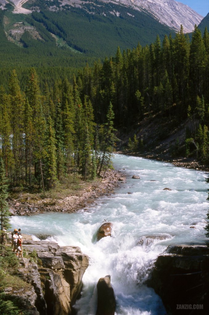 Back in 2002 I took also this alternative shot, taken from the main viewpoint on the bridge crossing the Sunwapta River. From that point you can see just the icy river embedded into the seemingly endless sea of green trees and – at the bottom of the frame – you can see the water thundering down.