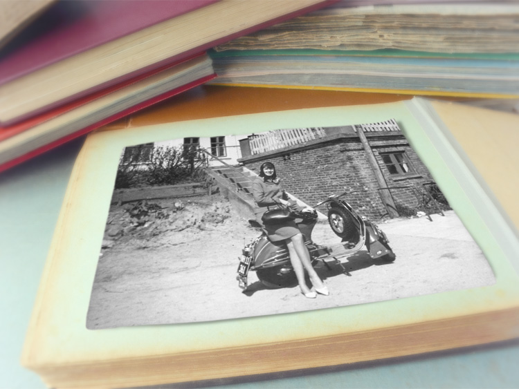 Here’s one of them: My mother (23) poses on a Vespa motor scooter. The photo was shot by my father, but I guess they just used the scooter as a prop. The numberplate looks Danish, and the trip from Kiel to Kollund would have take quite a while on a scooter.