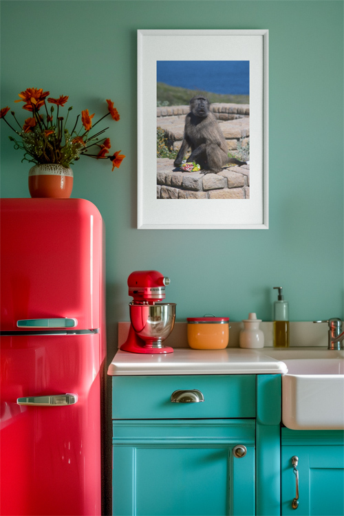 It is also common at the Cape of Good Hope in South Africa where we saw how a male chacma baboon did a surprise attack on a tourist who carried a bag of chips. The tourist dropped the chips bag which was quickly grabbed by the baboon who ran away. On a small wall, the animal sat down and enjoyed the chips. I already had the zoom lens on my camera and could easily capture a photo of the baboon.