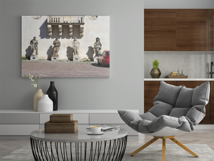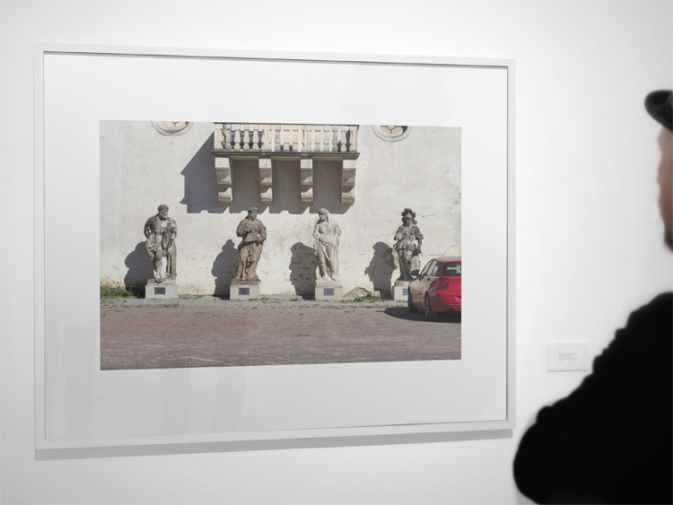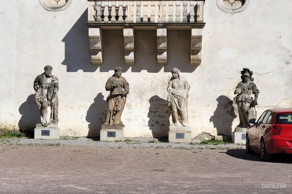 AUGUST 2025 – Four statues and a red car at the castle of Bernburg (Saale) in Germany. Photo © Mark Zanzig/zanzig.com