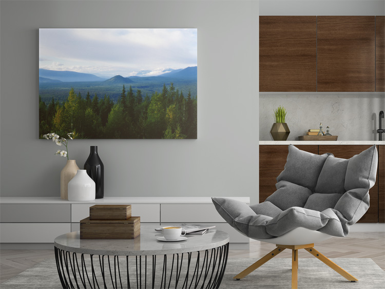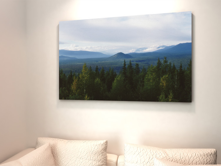This image shows the magnificient view from the Green Mountain Viewing Tower in the afternoon. Pyramid Mountain sticks prominently out from the seemingly endless woods. A bit of mist can be seen in the distance caused by heavy rain that came down earlier that day.