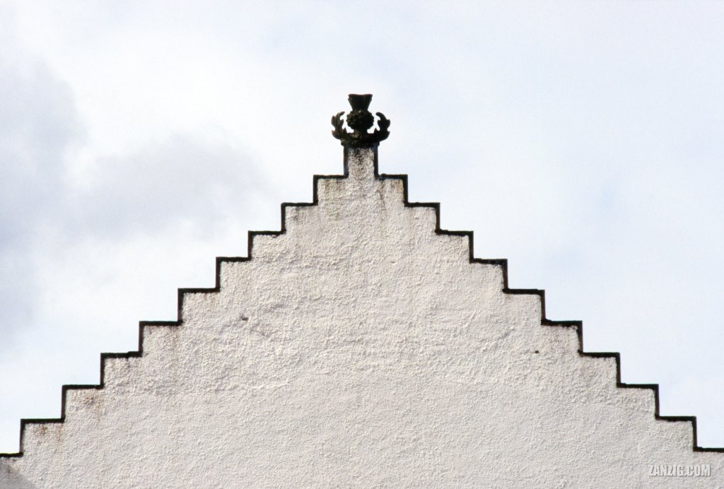 This photo shows the top front of a side building of the castle. I deliberately picked an almost graphical approach to highlight the stairs left and right that lead to the small statue at the top. I love that image.
