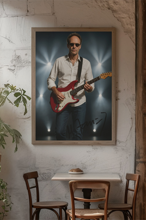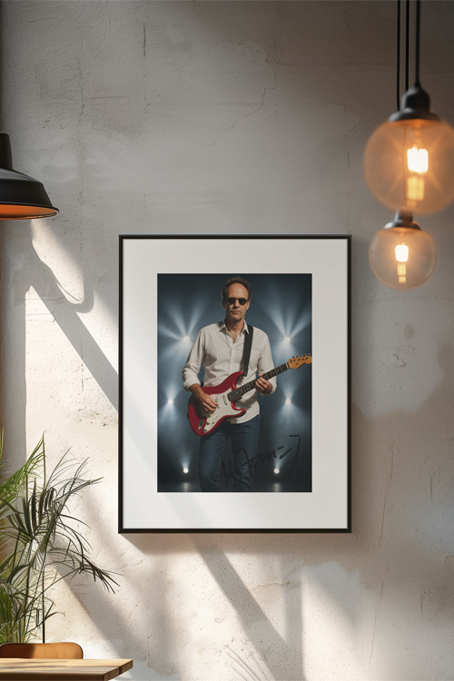 MAY 2025 – An AI generated image shows Mark Zanzig as rockstar on a stage playing a bright red guitar while wearing sunglasses, a white shirt, and dark denim jeans. © Mark Zanzig/zanzig.com/Photo: ChatGPT