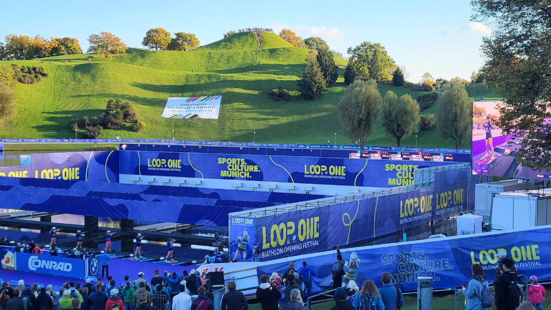 The Loop One Festival opened the Biathlon season 2025/26 right in the heart of Munich. Top Athletes performed their races on roll skis on a track around the Olympic Lake, stopping for the shooting in front of the Olympic Stadium.