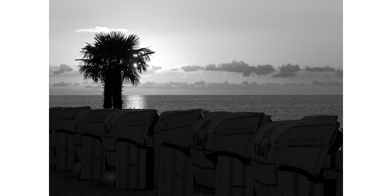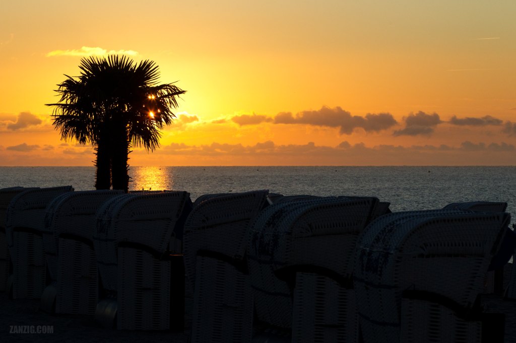 AUGUST 2025 – The branches of two palm trees partly cover the rising sun at the beach of Grömitz in Germany. Photo © Mark Zanzig/zanzig.com