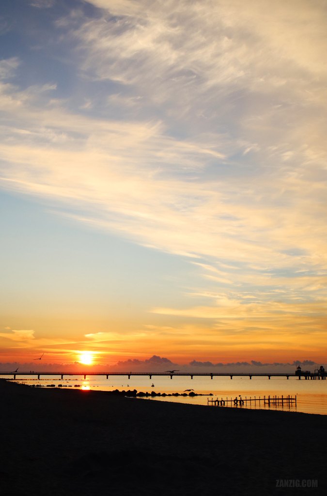 And so I went to the central beach in Grömitz to enjoy the sunrise. Seagulls were having roaming the beach to find some food, the beach and the long sea pier created a nice contrast, but the sunrise with its golden light got the center stage.
