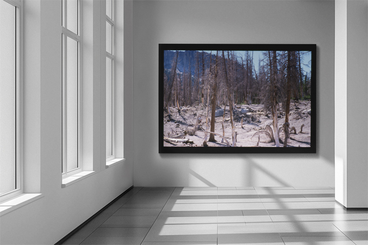 I deliberately left the black border (caused by the slide frame) “as is” because I felt it is a good match for the topic. And I think the image is awesome: The blue sky, the dead trees, the bright soil – a deadly beauty.