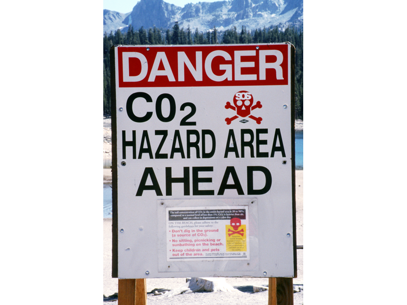 This is caused by a high CO2 concentration at Horseshoe Lake that reaches levels that can kill trees and pose a suffocation risk to humans. While normal atmospheric CO2 is around 360 parts per million (ppm), concentrations in the tree-kill zones can exceed 100,000 ppm in the soil and tens of thousands of ppm in the air near the ground. Heavier-than-air CO2 collects in depressions, making the areas near Horseshoe Lake dangerous, especially in tents or snow caves.