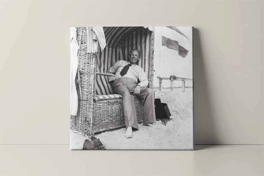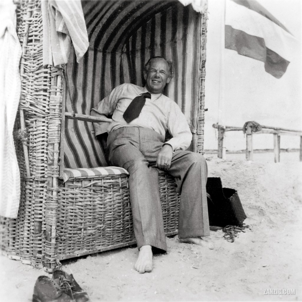 1949 – Otto Schweim sits in a traditional beach chair in St.-Peter-Ording in Northern Germany. Scan © Mark Zanzig/zanzig.com