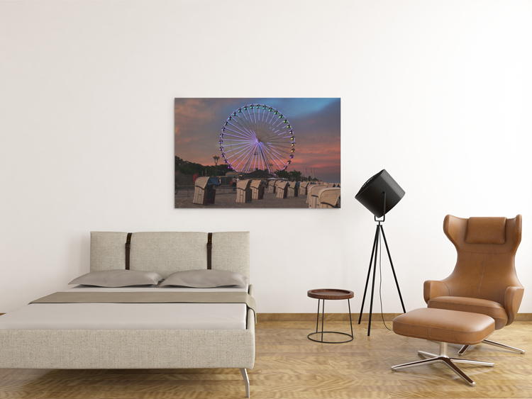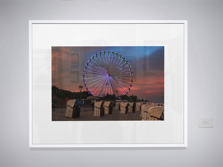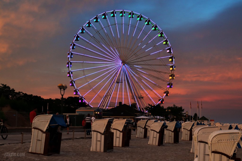 AUGUST 2023 – An illuminated big wheel shows the silhouette of a dancing woman at sunset time at the beach of Grömitz, Germany. Photo © Mark Zanzig/zanzig.com