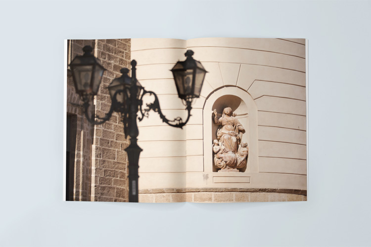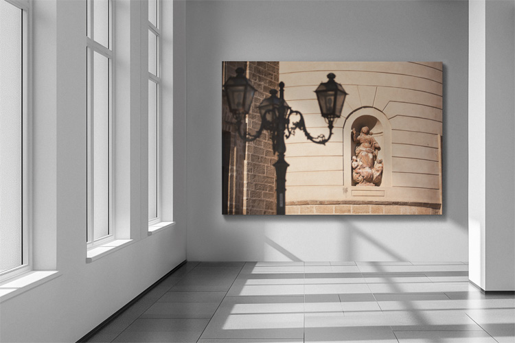 My photo shows the lovely statue that has been embedded into the exterior walls of the cathedral, right next to the small main entrance. By using the tele lens I could integrate the street light into the composition, which adds a nice contrast.