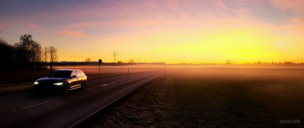 Anyway, I happened to be in Brunnthal yesterday, and the approaching sunset was overwhelming. There was slight fog rising from the fields and meadows at the Glonner Straße which is situated in the east of the village. The sky was beautiful, too, and when a car approached my location I captured the perfect shot. Well, perfect for me, at least, and ignoring the fact that it’s a smartphone image (boo!)