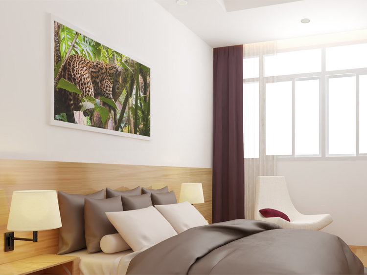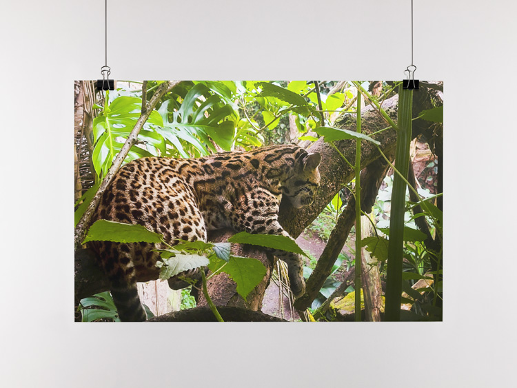 My photo shows a young leopard resting on a tree trunk in the half-shadow of the surrounding leafs.
