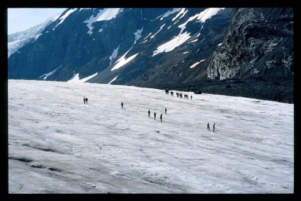 AUGUST 2002 – Hikers walk on the frozen surface of the Columbia Icefield and the Athabasca glacier on a bright summer day. © Mark Zanzig/zanzig.com
