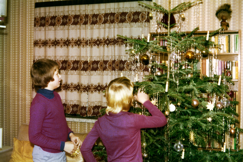 DECEMBER 1975 – Joined by a friend, Mark Zanzig admires the Chistmas tree in his home in Altenholz, Germany. © Inga Zanzig/zanzig.com