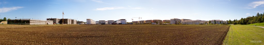 Let’s start the new year with a true gem from my archive that sat unused in the folder for a long time. It shows a panoramic view (composed from four images) of the development area in Unterhaching, Germany, called Stumpfwiese. In the front you see a field that was still actively maintained by the farmer while in the back new buildings arise: On the left, the school is being constructed , the cranes in the center belong to a site where a retirement home is built. At the edge of the field (center-right) is the sales booth for the area.