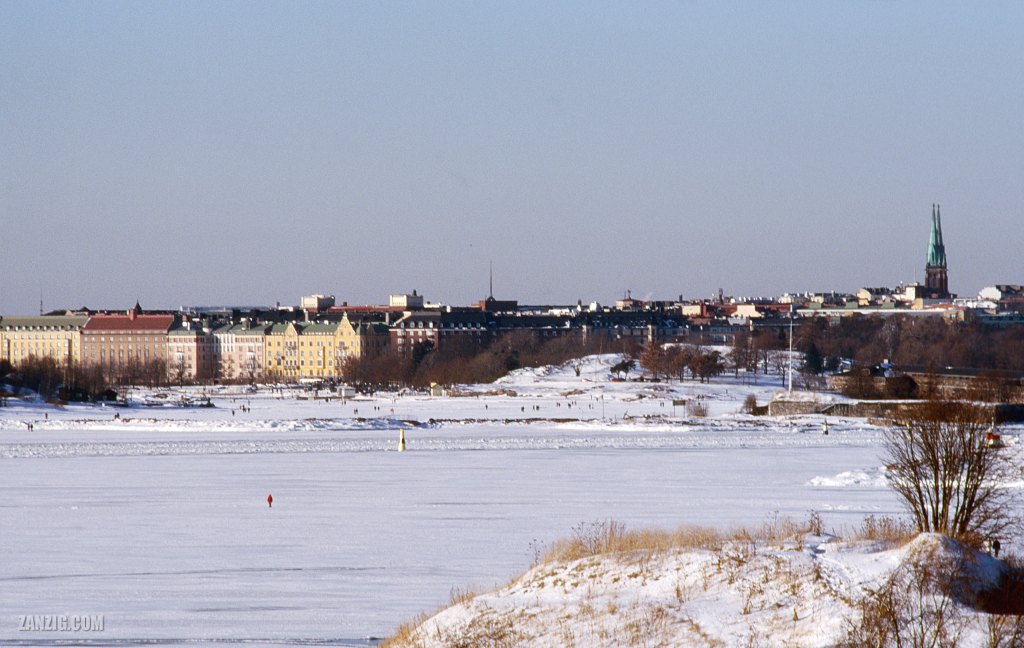 On one extremely cold morning we took the passenger ferry to Suomenlinna, a former fortress island. Somewhere on the way back I captured this photo of people walking on the frozen Baltic Sea near Havshamnen. I could not find where I took the photo, exactly, but the houses center left are clearly the ones in Merikatu, and the unique twin towers of the Johanneksenkirkko add another reference point.