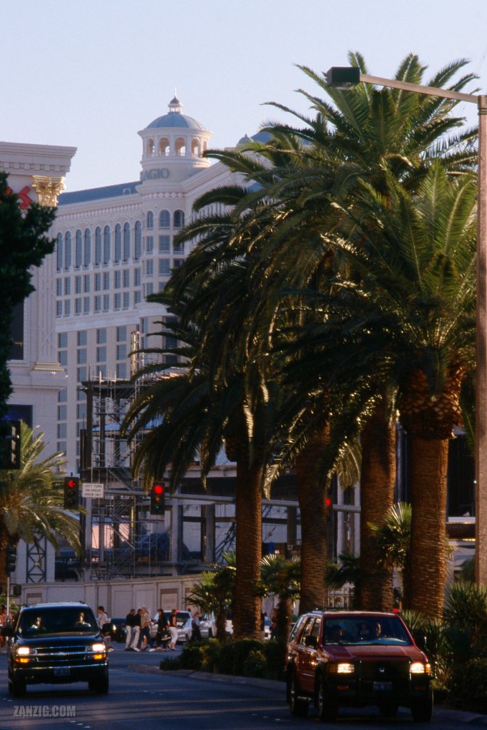My photo shows the Bellagio that overtowers the boulevard. I like this image because the boulevard looks unexpectatly small and not as wide as it really is. The palm trees make it look more like Palm Springs. And the light of the late afternoon sun dips the scene into warm hues.