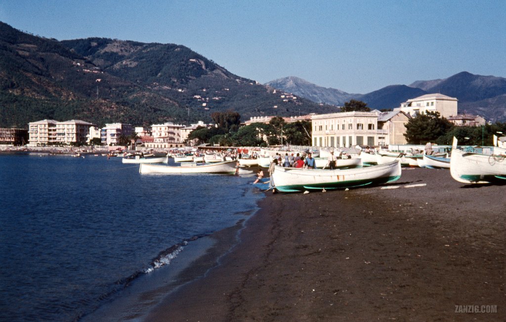 Take this image, for example. Like all posts this week, it is from the large lot of slides from 1955 to 1963. The image shows the beach of the town Sestri Levante in Italy. The photographer apparently spent the afternoon and evening here, and he could enjoy the warm sunlight of the afternoon and the approaching sunset.