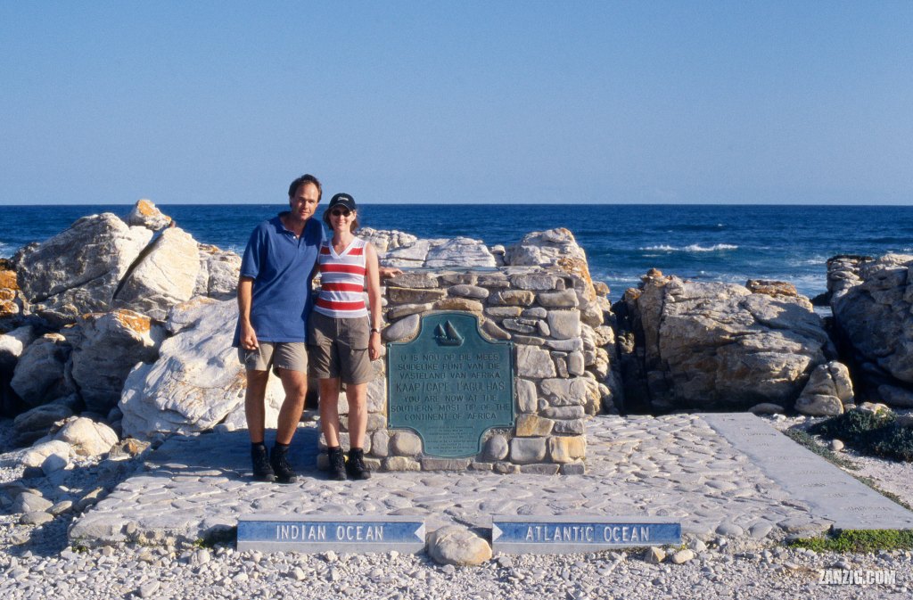 MARCH 2004 – A couple poses next to the official landmark near Cape Agulhas, South Africa, where the Atlantic Ocean and the Indian Ocean meet. © Mark Zanzig/zanzig.com