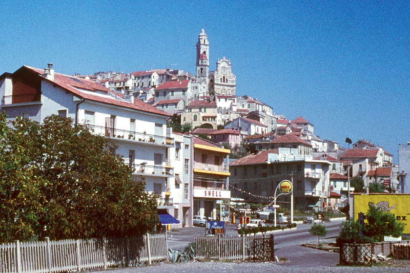 In this image from a trip to Liguria, our photographer stayed in the early 1960s in Bordighera, and he also made an excursion to Varazze, roughly 120 kilometers east of Bordighera. Along the way he also passed Cervo, a town with a hisoric center that is situated on a hill. At the top of the hill is San Giovanni Battista, a strikingly beautiful baroque church.