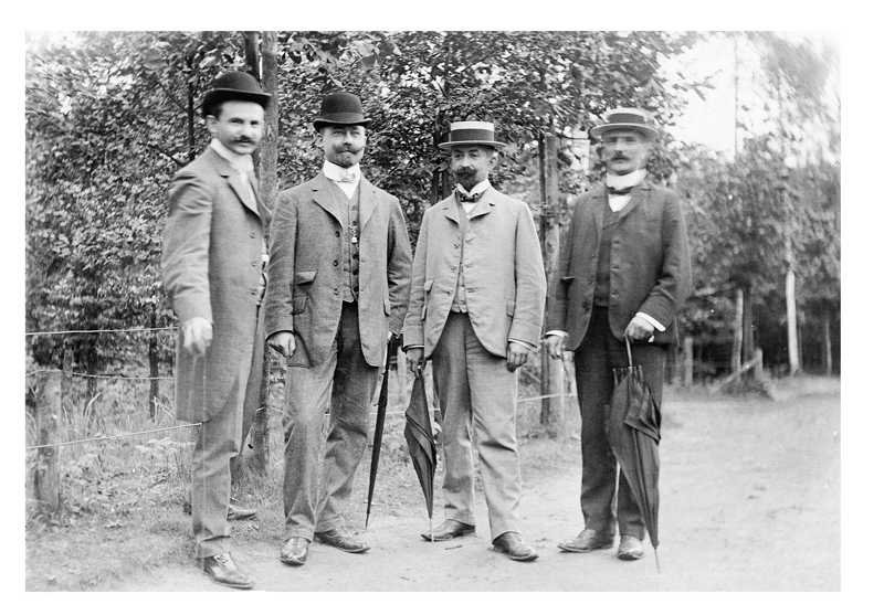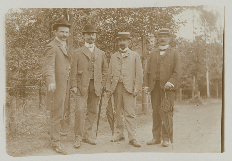 I recently stumbled upon this historical photograph that shows a group of four men outdoors, most likely in a large park taking a stroll. The clothes – including suits, waistcoats, and bowler or formal hats – indicate a period around the First World War. Two of the men hold umbrellas, a common accessory for outings at that time.